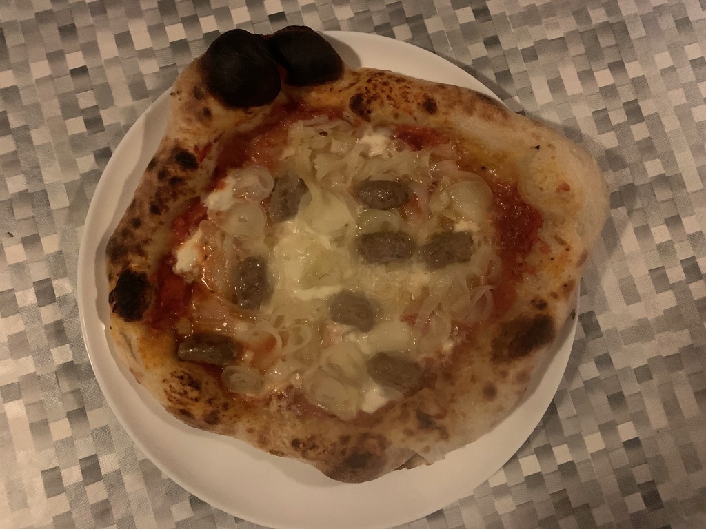 Impasto con farina Caputo Nuvola ed idratazione al 73%, copertura del solo cerchio esterno con pomodori "pelati" sgocciolati da 24 ore e sminuzzati a mano, assenza di pomodoro nel centro, cascata di mozzarella di bufala scolata da 24 ore tagliata a listarelle, ornamento di cipolle bianche appassite, pepite di luganega scottata, spolverata di Pecorino.