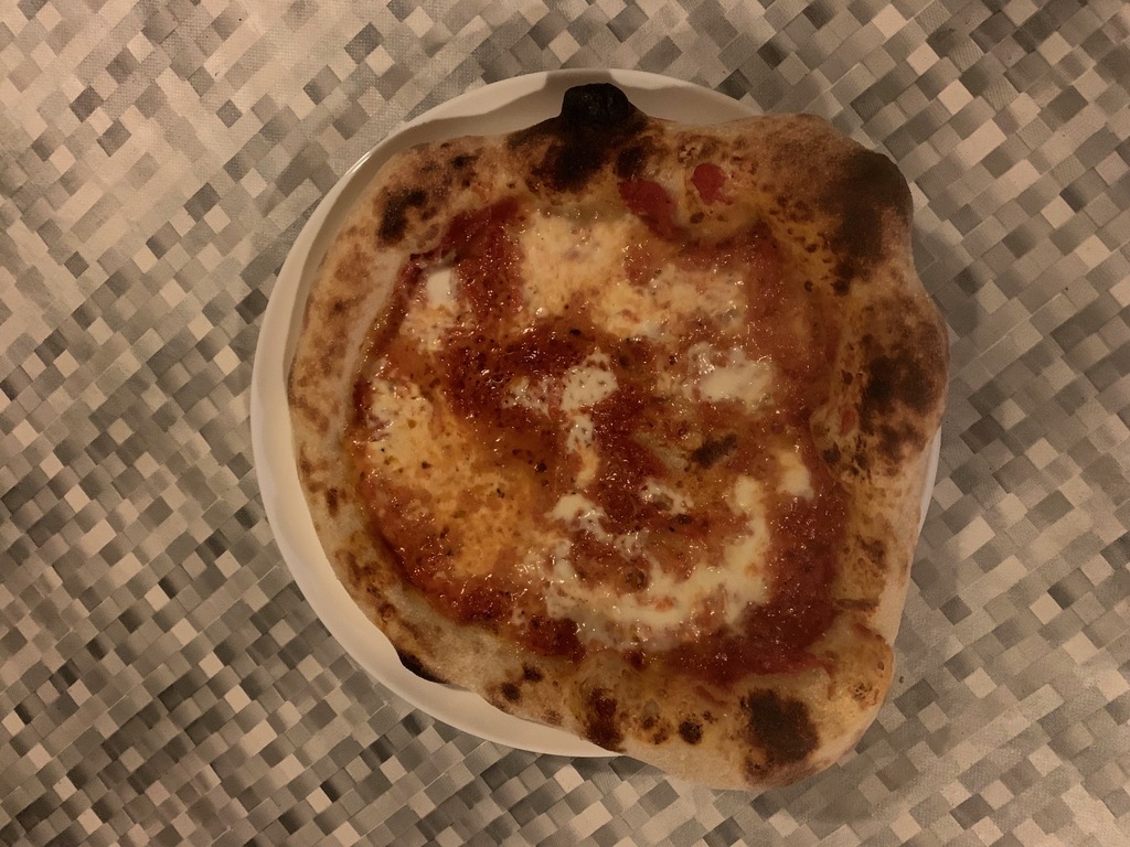 Impasto con farina Caputo Nuvola ed idratazione al 73% , mozzarella senza lattosio scolata da 24 ore tagliata a listarelle, spolverata di Parmigiano Reggiano.