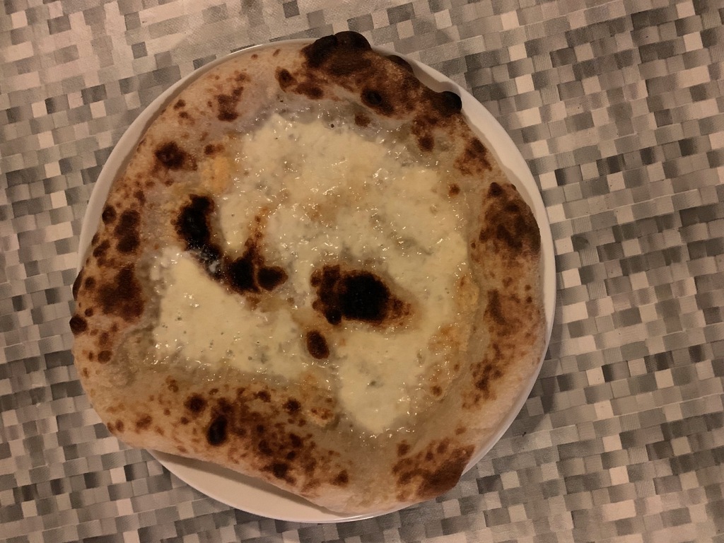 Impasto con farina Caputo Nuvola ed idratazione al 73%, copertura del solo cerchio esterno con pomodori "pelati" sgocciolati da 24 ore e sminuzzati a mano, assenza di pomodoro nel centro, cascata di mozzarella di bufala scolata da 24 ore tagliata a listarelle , gocce di gorgonzola, spolverata di Parmigiano Reggiano. Post cottura, rosette di pancetta arrotolata, fili con riduzione di pecorino.