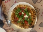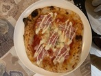Impasto con farina Caputo Nuvola ed idratazione al 73%, copertura del solo cerchio esterno con pomodori "pelati" sgocciolati da 24 ore e sminuzzati a mano, assenza di pomodoro nel centro, cascata di mozzarella di bufala scolata da 24 ore tagliata a listarelle , gocce di gorgonzola, spolverata di Parmigiano Reggiano. Post cottura, rosette di mortadella al pistacchio, assaggio di squaccherone, spolverata di granella di pistacchio.