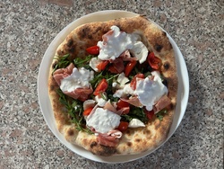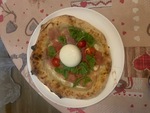 Impasto con farina Caputo Nuvola ed idratazione al 73%, copertura del solo cerchio esterno con pomodori "pelati" sgocciolati da 24 ore e sminuzzati a mano, assenza di pomodoro nel centro, cascata di mozzarella di bufala scolata da 24 ore tagliata a listarelle , gocce di gorgonzola, spolverata di Parmigiano Reggiano. Post cottura topping di rucola, rosette di prosciutto crudo, tocco di pomodorini ciliegini ed assaggio di stracciatella.