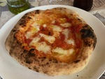 Impasto con farina Caputo Nuvola ed idratazione al 73% , copertura di pomodori "pelati" sgocciolati da 24 ore e sminuzzati a mano, mozzarella di bufala scolata da 24 ore tagliata a listarelle, spolverata di Parmigiano Reggiano.