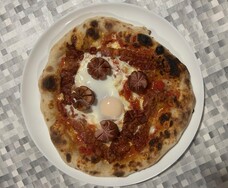 Impasto con farina Caputo Nuvola ed idratazione al 73%, copertura con pomodori "pelati" sgocciolati da 24 ore e sminuzzati a mano, cascata di mozzarella di bufala scolata da 24 ore tagliata a listarelle, spolverata di Parmigiano Reggiano. In cottura, uovo al tegamino con cuore morbido, listarelle di bacon croccante e ciuffetti di wurstel.