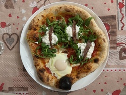 Impasto con farina Caputo Nuvola ed idratazione al 73%, copertura con pomodori "pelati" sgocciolati da 24 ore e sminuzzati a mano, cascata di mozzarella di bufala scolata da 24 ore tagliata a listarelle, spolverata di Parmigiano Reggiano. In cottura, uovo al tegamino con cuore morbido. Post cottura, letto di rucola e filetti di alici adagiate su fiori di stracciatella.