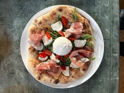 Impasto con farina Caputo Nuvola ed idratazione al 73% , copertura di pomodori "pelati" sgocciolati da 24 ore e sminuzzati a mano, mozzarella senza lattosio scolata da 24 ore tagliata a listarelle, spolverata di Parmigiano Reggiano. Post cottura topping di rucola, tocco di pomodorini ciliegini, rosette di prosciutto crudo, il tutto sovrastato da una burrata fresca senza lattosio.